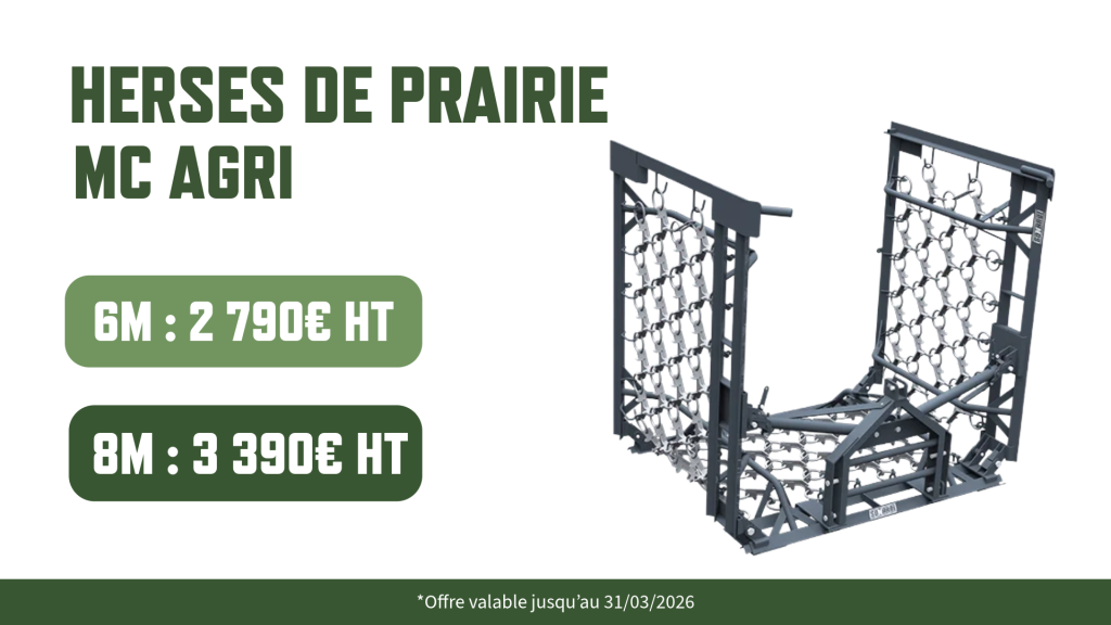Entretenir ses prairies n’a jamais été aussi simple. Pour vous accompagner dans la préparation de la saison, nous proposons une offre spéciale sur les herses de prairie MC Agri, reconnues pour leur robustesse, leur efficacité et leur facilité d’utilisation.